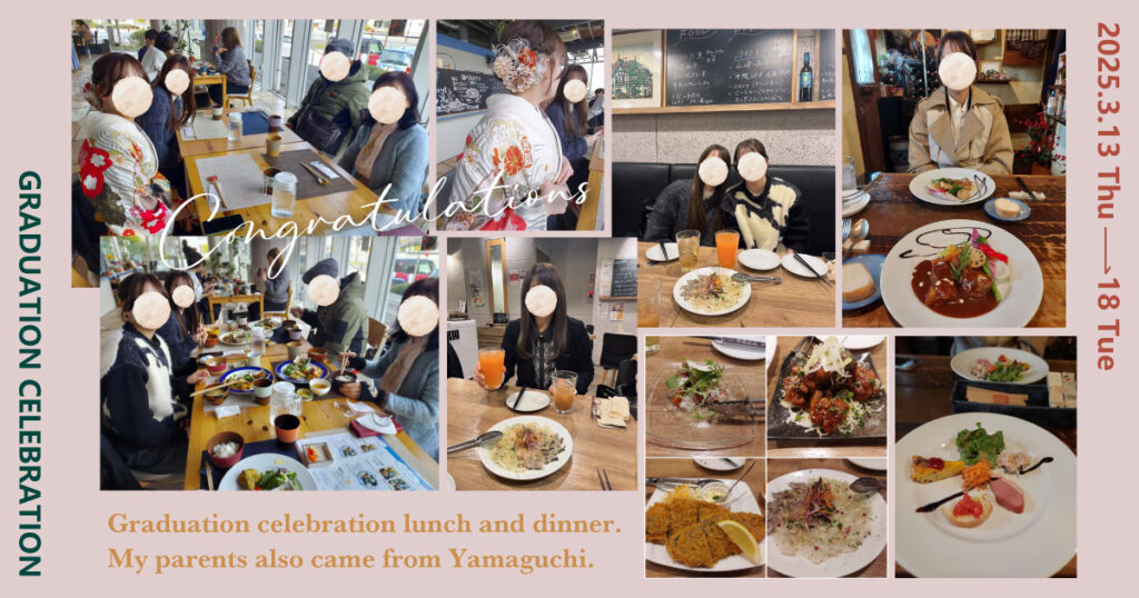 「ビストロKai」では娘と2人、コースランチを楽しみ、北九州での卒業式には、山口から両親も駆け付けてくれ、ホテルでの前泊から「55食堂」でのディナー、当日の「そらいろ食堂」でのランチまで、久々の家族団らんを味わいました。